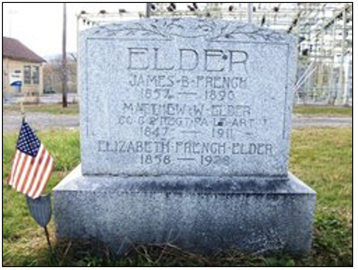 4.30 James Buck French, b. 1856 in Franklin County, PA. He was buried in the same cemetery, Roxbury Union Cemetery, as his great-grandmother, Rebecca French. He died in 1890 aged 32-33. He was buried along with Matthew W. Elder of Co. G 2 Regt, PA Light Artillery, 1847-1911; and with Elizabeth French Elder, his sister and wife of Matthew, born 1858, died 1928. In the 1870 census of Fannett, James was age 14 and living with his parents Solomon 40 and Mary 35, and siblings William 16, and Ida 11.