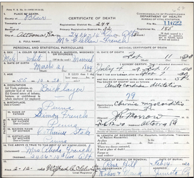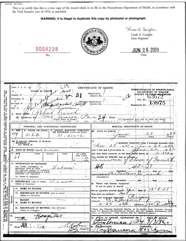 contributing factor. The Ancestry.com index for Pennsylvania death certificates