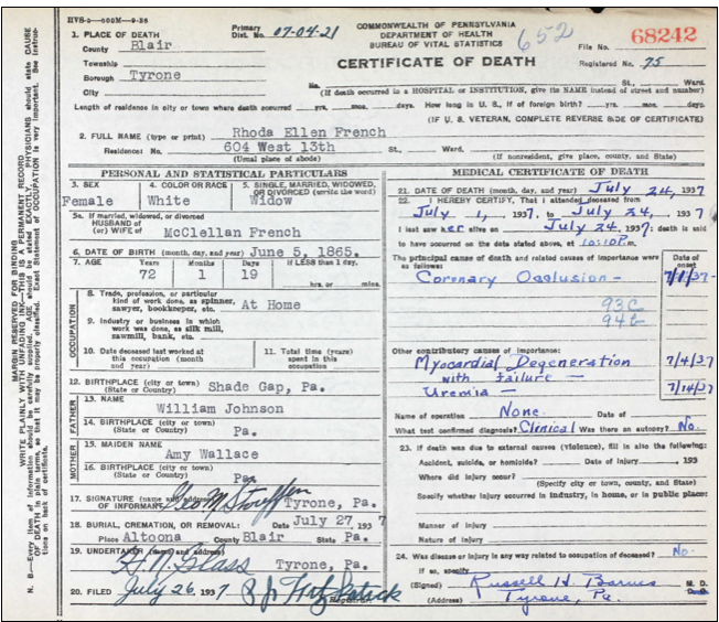 Death of Rhoda Ellen French, wife of McClellan French wife Death paper. McClellan’s birth name was Porter McClellan French.