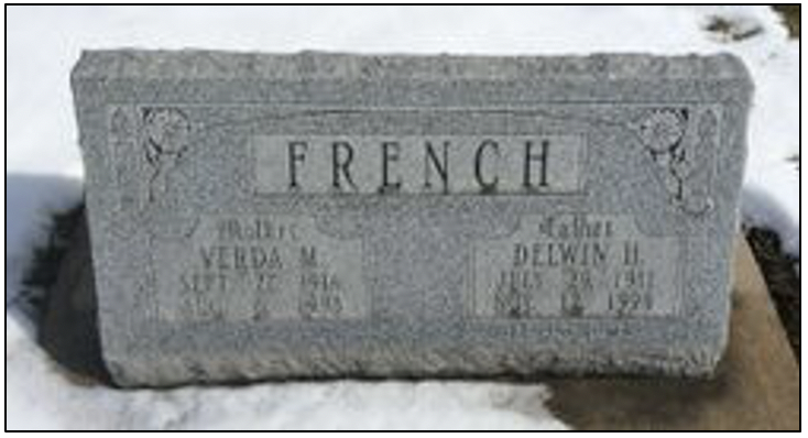 5.11* Delwin Howe French, b. 29 Jul 1911 in Wataga, Knox Co., IL, m. 27 Sep 1939 to Verda Minnie Slane [3], the dau. of George and Jeannette Slane. Both Delwin and Verda died in 1998; Delwin d. 12 Nov 1998 in Galesburg, Knox Co., IL. Verda died 6 Aug 1998, aged 81. They were buried in the Sparta Township Cemetery, Wataga, Knox, IL. In the 1920 census of Galesburg, Knox Co., IL, Delwin was living with his parents and siblings. Not sure where Della Rae (West) French comes in. In the 1930 census he was living in Sparta, Knox Co., IL, with the Williamson family. Delwin was a Major in the 99th Infantry of WWII.