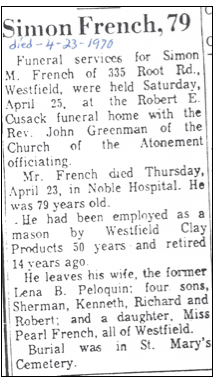 5.16* Simon Miller French, b. 16 Oct 1890 in McVaytown, PA, d. 23 Apr 1970 in Westfield, Hampden, MA, m. Lena B. Peloquin and had 5 children: Pearl Violet French, Sherman Earl French, Kenneth R. French, Richard Allan French, Robert Victor French. In 1932 when his father died, Simon was living in Springfield, MA. Simon moved to Massachusetts to get married.