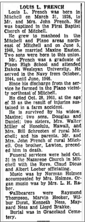 French, b. 31 Mar 1926 in Mitchell, Davison, SD, d. 28 Oct 1961, aged 35,