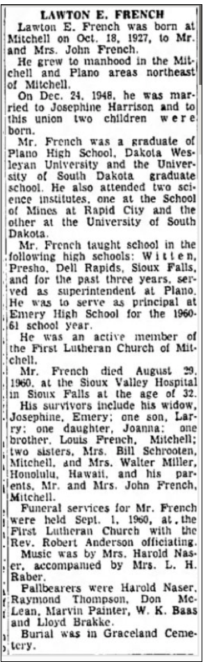 6.10 Lawton Earl French, b. 18 Oct 1927 in Mitchell, Davison, SD, d. 29 Aug 1960 aged 32, and was buried in the Graceland Cemetery in Mitchell, Davison, SD.