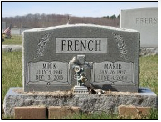 6.32 Michael “Mick” Wayne French, b. 3 Jul 1947 in Altoona, Blair, PA, d. 3 Dec 2013 aged 66 in Duncansville, Blair, PA, m. Erla Marie Ritchey (maiden name) Weyandt (previous husband’s name) on 9 Jul 1993 in Winchester, Winchester, VA, who was born in 1937 and died in 2004. Michael lived in Williamsburg. He was buried in the Claysburg Union Cemetery in Claysburg, Blair, PA.