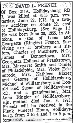 6.37 David Lee French, b. 28 Jun 1955 in Altoona, Blair, PA, d. 28 Jun 1973 in Hollidaysburg, Blair, PA, aged 18 on his birthday. His mother died 9 Jan 1973, only a few months before he died.