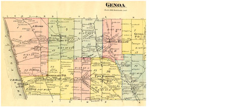 You can pinpoint the French and Price farms in Genoa looking at the pink lower rectangle labeled DIST No. 11. The farm is at the bottom of this district and landowners are ÒL. PriceÓ (Lewis Price – see 2.1) and ÒJ. FrenchÓ (Jeremiah French – see 2.7). Other farms nearby are owned by Wager, Johnson, and Cheeseman. See enlargement below.