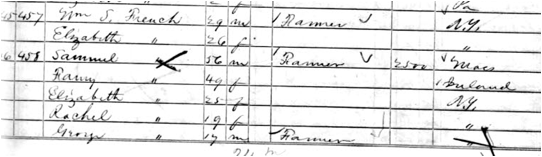 Samuel is listed in the 1840 Federal Census of Chemung, Chemung Co., NY as 1 male under 5 (Jeremiah), 1 male between 5-10 (George), 1 male 10-15 (unk), 2 males 15-20 (unk), 1 male 20-30 (William), 0 males 30-40, 1 male 40-50 (Samuel), 1 female under 5 (Mary), 1 female 5-10 (Rachel), 1 female 10-15 (Elizabeth), 1 female 15-20 (Frances), 0 females 20-30, 0 females 30-40, 1 female 40-50 (Sarah), no slaves, total of 12 family members of which 4 were working in agriculture, marked in red (only a guess). No other French is listed. In the 1850 census, each individual name is listed, door to door, per household.