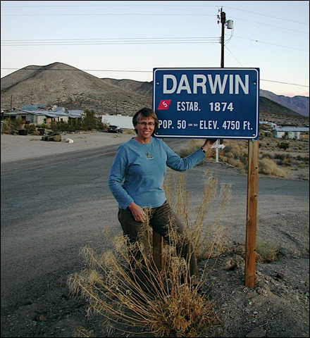 Mara French (not a descendant of this line) standing by the signpost of the town of Darwin, founded by Erasmus Darwin French ca. 1850 when he found silver (not gold) in this area). The town as of Nov 2009 has 23 inhabitants -- a real ghost town with many abandoned cars and shacks. The town is just outside Death Valley National Park and is exactly half way between Death Valley (-252 ft below sea level) and Mt. Whitney, which are the lowest and highest spots in the U.S.A.