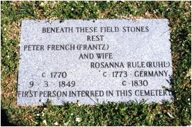 Peter and Rosanna French lived in a German community in Virginia, but by the time they came to Tennessee they were much involved with the Methodist Church and established the New Salem Church. Rosanna is said to have suggested the name, and is the first person to be buried its cemetery, which is located directly in front of the present church building.[27] By October 1983, Rebecca French Freeborg had placed a memorial to Peter and Rosanna French in the New Salem Church cemetery to mark their burial spots. The memorial is included in the photograph below.