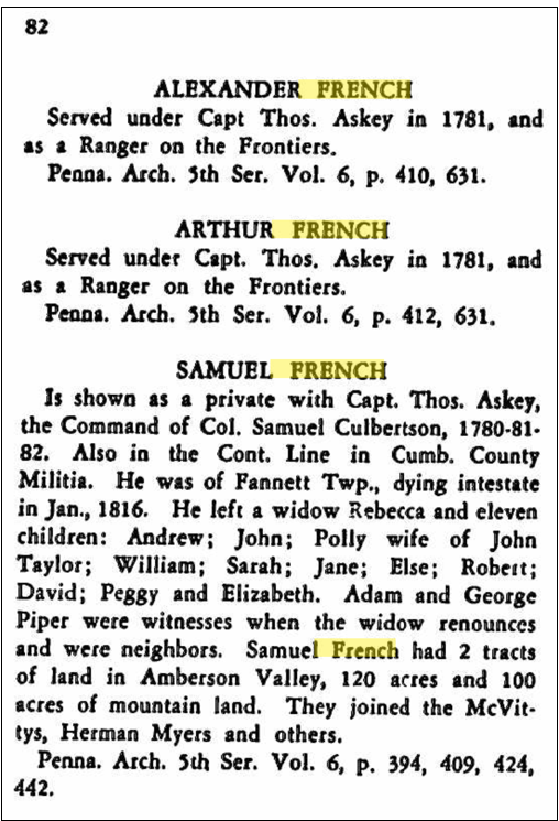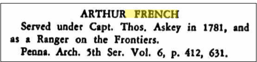 1.1 Arthur French, b. ca. 1750 in Philadelphia, PA, lived in 1788 in the town of Upper Delaware, Philadelphia County, Pennsylvania. Arthur probably died ca. 1793 in Delaware where he was buried. Capt. Thomas Askey was of Shippensburg, Cumberland, PA in 1786, 1787, and then of Fannett, Cumberland, PA in 1778, 1782. Capt. Thomas Askey was also a member of the Middle Spring Presbyterian Church in Middle Spring, PA.