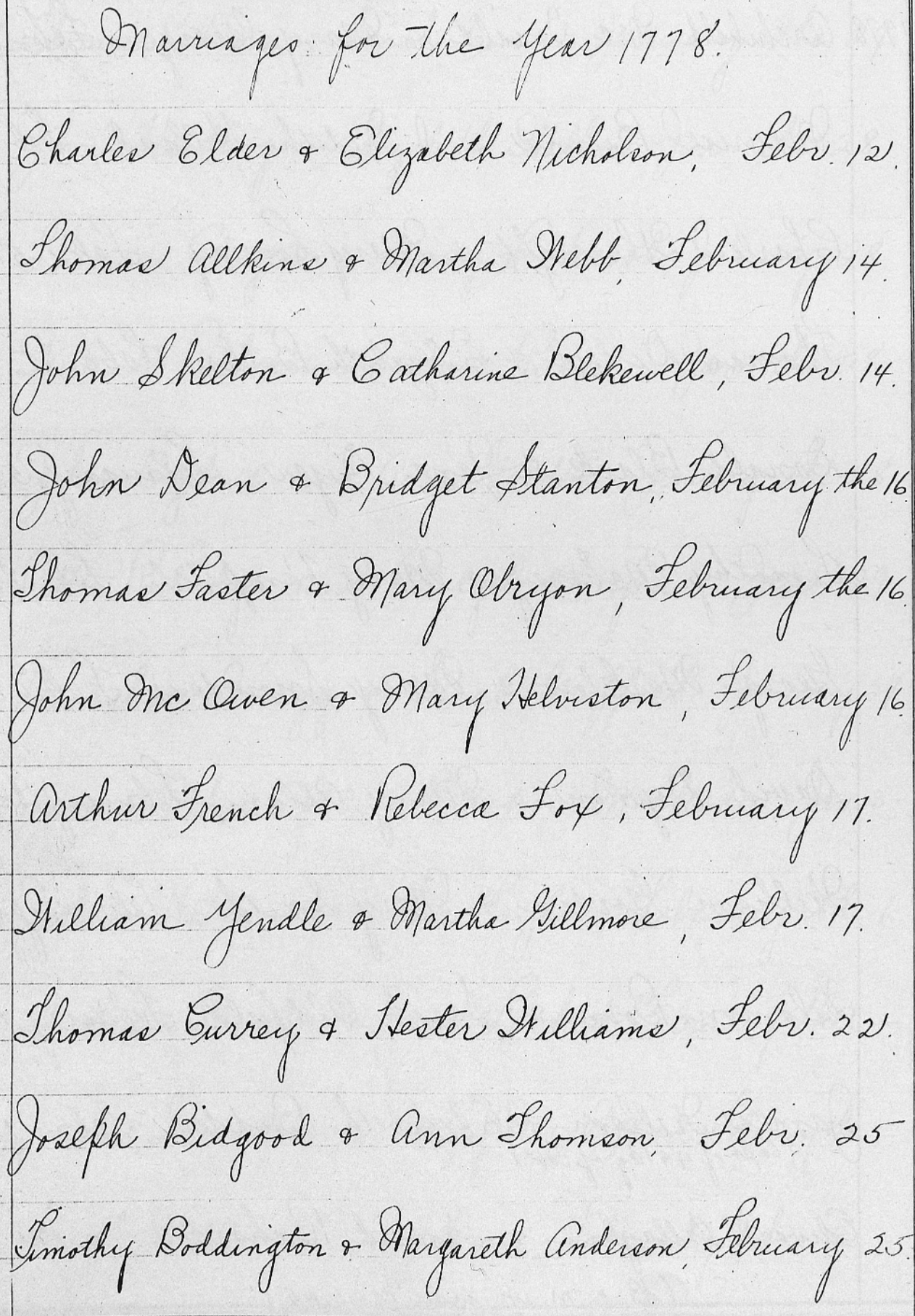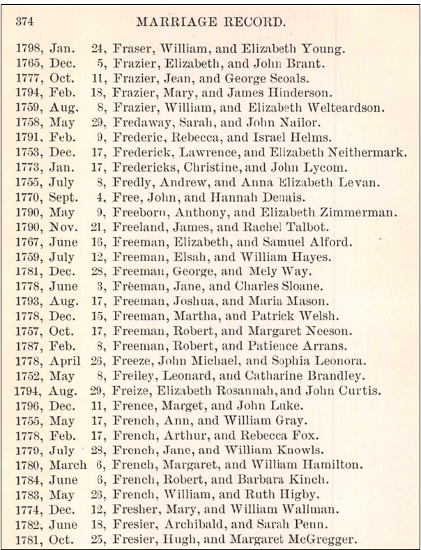 [3] Pennsylvania, U.S., Compiled Marriage Records, 1700-1821 for the surname French, 33 hits, website: https://www.ancestry.com/search/collections/2383/?name=_French&count=50&name_x=ps_1. Other surnames include Starkey, Bendelow, Gordon, Harper (FFA Chart #26), Richkey, Higby, Thompson, Davies, Robinson, Heimer, Cust, Ker, Stanton, Voight, Knowls, Gray, Kinch, Hamilton, Parsons, Cratter, Kerr, Clark, Eakin, Stackhouse, Stokes, Wayne, Fox, Ferguson, Sparron, Thomson, Lawrence, O’Neal. Because Arthur was born in 1750 Philadelphia, his parents probably married in Philadelphia ca. 1745. The only possibilities of marriages in Philadelphia and to unvale the parents of Arthur would be the marriage of Samuel French to Mary Thomson on 11 Jun 1736 at the Presbyterian Church, or Cherry John French who married Patience Cust on 18 Jul 1730 in the First Presbyterian Church. No marriages exist in the 1740s or 1750s. Alexander French married Ann Cratter on 2 Mar 1761 in Christ Church, all in Philadelphia.
