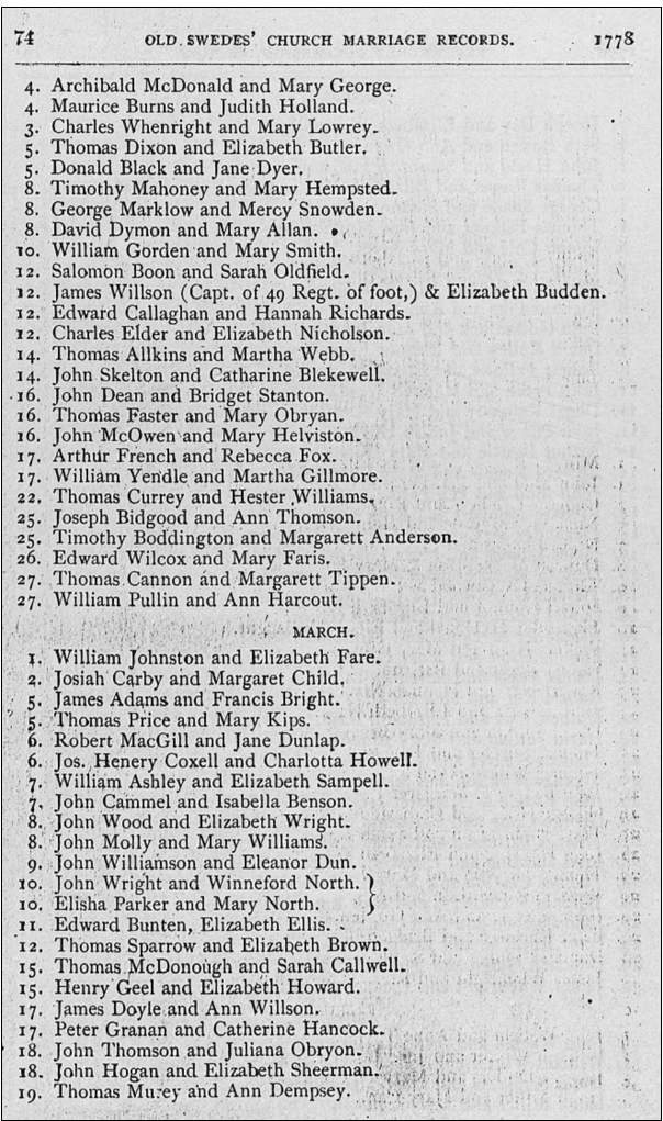 1778 Feb 17 – Arthur French age 28 married Rebecca Fox (or Fuchs if German) in Philadelphia, PA, and had at least 3 children after the Revolutionary War. They were married at the Gloria Dei Swedes’ Church in Philadelphia. Furthermore, Andrew French, who married Rachel Harper on 11 Aug 1788, was also married at the Swedes’ Church in Philadelphia, relationship if any is unknown. Other French marriages close to the marriage date 1778 and also at the Swedes’ Church in Philadelphia possibly indicating marriages of Arthur’s possible siblings were Jane French married William Knowls on 28 Jul 1779; Margaret French married William Hamilton on 6 Mar 1780; Robert French married Barbara Kinch on 6 Jun 1784; William French married Ruth Higby on 26 May 1783 [3].