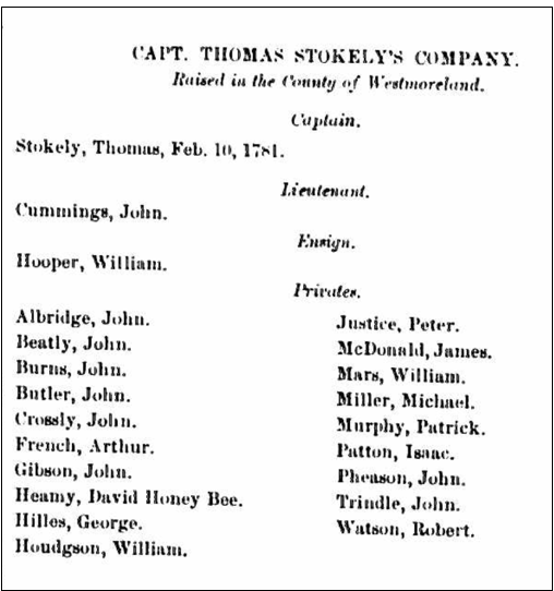 1781 Feb 10 – from History of the County of Westmoreland, PA, p. 461.