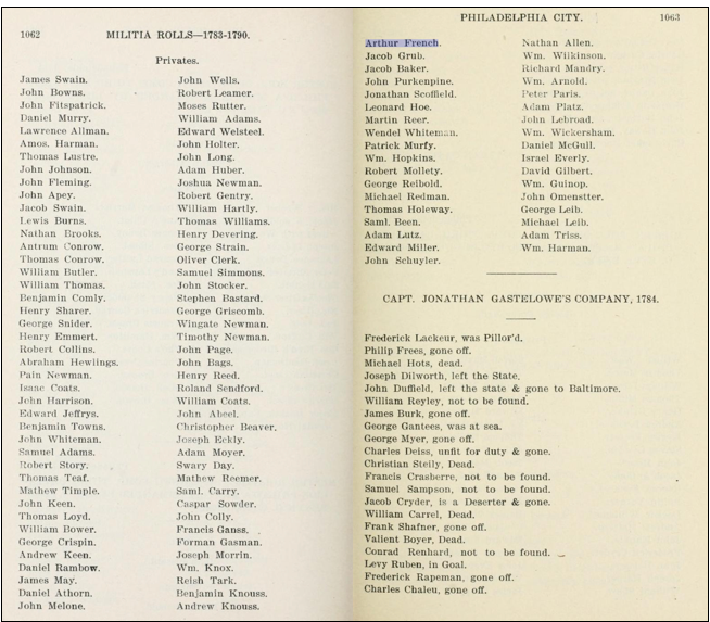 1788 – Arthur French lived in the town of Upper Delaware, Philadelphia County, Pennsylvania.