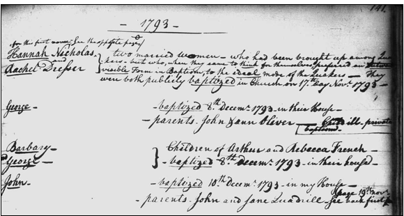 1793 Dec 8 – Son George French was born in Delaware, Philadelphia County, Pennsylvania. He was also orphaned as his father died the same year. Daughter Barbary French was baptized at the same time as George on 8 Dec 1793 in Wilmington, New Castle, Delaware, the daughter of Arthur and Rebecca French, at the Holy Trinity Church, also known as Old Swedes Church, in Wilmington, New Castle, Delaware.