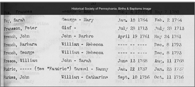 The following document shows the same date for the baptisms of Barbary and George French, but as the children of William and Rebecca French instead of Arthur and Rebecca French, also from the Old Swedes Church, in Wilmington, New Castle, Delaware. Another record shows “a” William French born 20 Dec 1758 in Philadelphia, PA, the son of John and Hannah French.