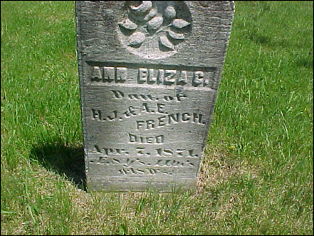 3.3 Ann Eliza C. French, b. 20 Apr 1862, d. 7 Apr 1871 at 8 years, 11 months, 18 days, the dau. of H. J. and A. E., and is buried at the Oak Center Cemetery in Fond du Lac Co., WI. She appears in the 1870 census of Oakfield, Fond du Lac, WI, living with her parents, and her name is listed as Elina.