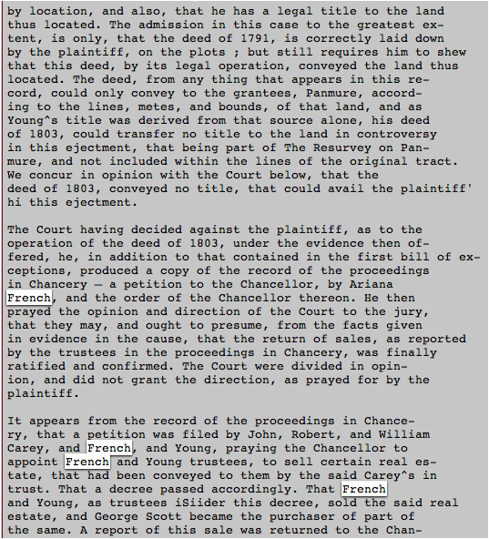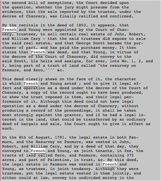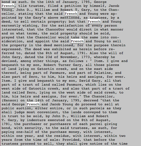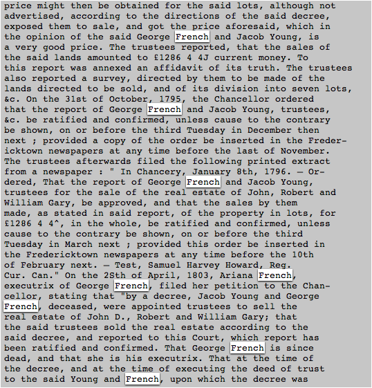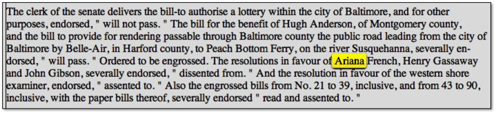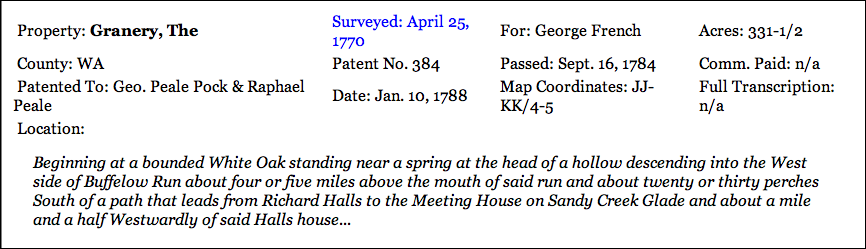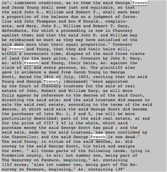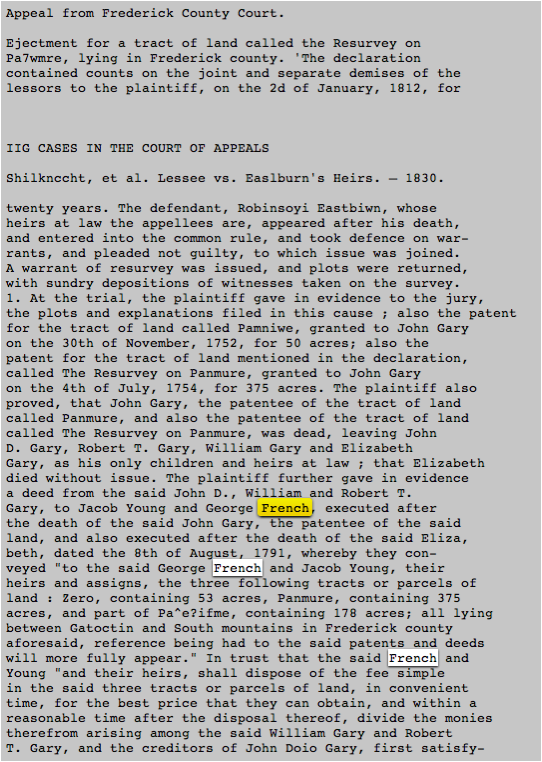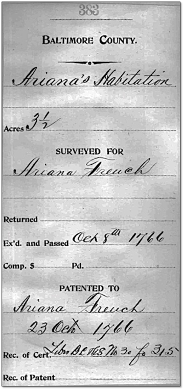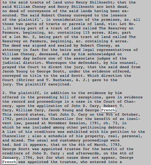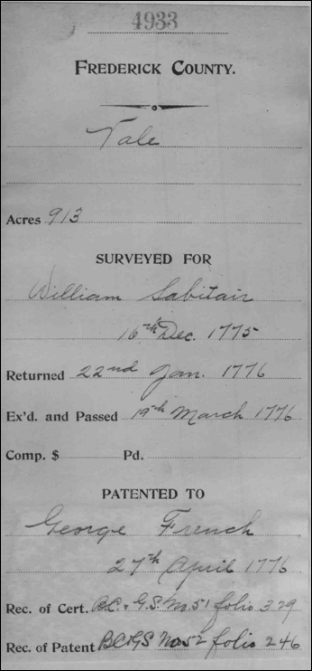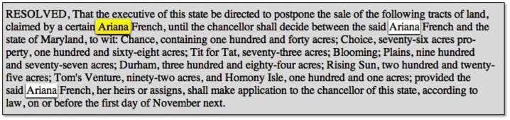 George and Thomas French were brothers, and Thomas also had a brother named George. The George French listed below is most likely from FFA Chart #195, or perhaps it is a list of several men named George French – we do not know. FFA Chart #195 also includes names Jacob French and Peter French; however, the land entries of George from Baltimore are from FFA Chart #166, except we do not know how Michael fits in. Ariana French was the widow of James French of FFA Chart #166. The Thomas French Esq. listed below is from FFA Chart #166, this chart. The other men listed are probably from other French families.