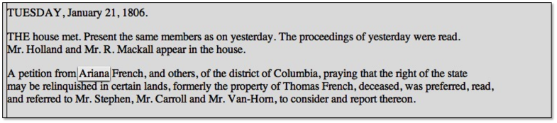 To make things even more complicated, James married Ariana Bankson (from Sweden), and George French, son of Thomas, married Ariana Scott; therefore, two women are named Ariana French, quite an unusual name. These names overlap and it is difficult to tell which is which, in fact, presently we believe both of them died in 1811, but we are unsure how to distinguish them apart from one another.