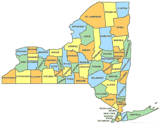 Map of New York (top) and Pennsylvania (bottom), which fit together at north/south borders. Note that the counties of Potter, Tioga, Bradford, Mifflin, and Northumberland in Pennsylvania are where this French family resided. In New York, they resided in Chemung, Tioga, and Broome Counties.