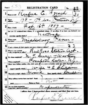 Considering Jeremiah French was born in 1759 in New Jersey, his father might have been born about 1740 or before in the U.S. or in England, but we do know that in 1759, he was living in New Jersey. His fatherÕs name could have been Jeremiah or Moses or William, the names that Jeremiah gave his sons. Moses and William both appear in Sandyston, NJ, in the generation before Jeremiah, also in Sandyston. At this time in history, and especially with this family, there was a strong tradition of naming children after their ancestors. The first U.S. census of New Jersey took place in 1830; the French family had already left that area by then.