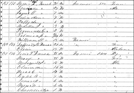 1.2* Moses French, b. 1820 in TN, m. Loucinda age 29 in the 1850 census, and with their 7 children. Loucinda was b. in AL.