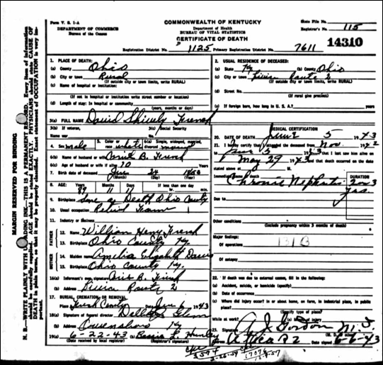 David d. 29 Dec 1819 in Ohio Co., KY, his son was David Shively French, and his son was William Henry French, and his son was David Shively French, and his son was Felix Latney French (DNA Test 10303).