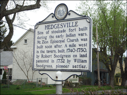[9] William Moore, email: billmkate@msn.com (email good in 2011). 304-267-2916. The picture of the Town of Hedgesville historical sign was taken beside my house of years gone by. My wife and I restored an 1836 edifice called the Summit House and had the camera been turned the other way it would have been displayed. I do a tour of this area for the Scotch-Irish Quakers of the area and this added much to the background of understanding.