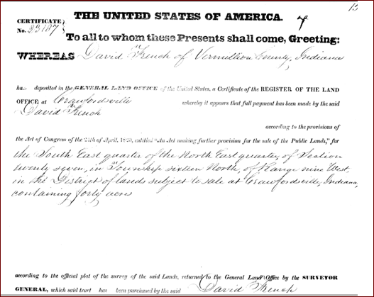 2.4 William French, b. 1821-1825, as stated in the 1830 census. Not in 1840 census. He m. Mary who was b. 1821, d. 26 Feb 1856, buried at Trowbridge Cemetery, Vermillion Co., IN.