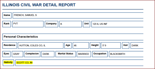 There appears to be several men named Samuel S. French born in 1818. The correct one for this line is Samuel French who appears in the Hutton, Coles Co., IL, census of 1880, married to Nancy Anne Ingram on 1 Apr 1838 in Helt, Vermillion Co., IN, d. Jul 1888 in Hutton, Coles Co., IL, and is a blacksmith. This census states that he was born in Kentucky and his father was born in Ohio.