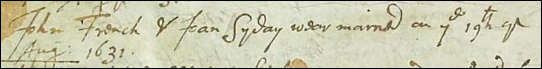 John m. Joan [17] or Joanna Siday or Syday perhaps in her hometown of Great Tey, Essex on 19 Aug 1631, when John was 32 years old. A William Sidey married an Elizabeth Warin (Warren) on 6 May 1574 in Twinstead; William Sidey could have been JoanÕs grandfather.