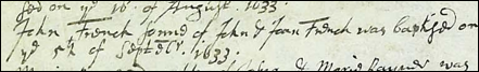 2.1 John French christened 5 Sep 1633 at St. Barnabas Church in Great Tey, County Essex, England. See image below.