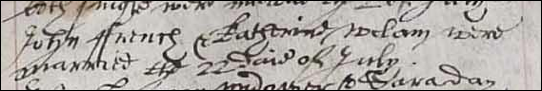 1.2* John French, b. ca. 1583 perhaps in Suffolk, but not at St. BotolphÕs Parish in Colchester; the parish register starts in 1560 and he is not listed. He m. Catherine Welam (might be Welham as that name existed in Essex at that time – in fact in Halstead) on 22 Jul 1605. D/P 203/1/1, Image 26.