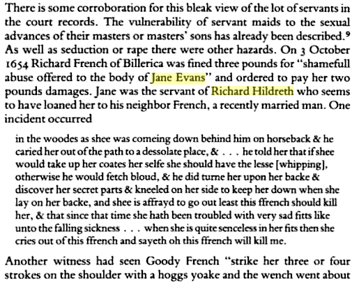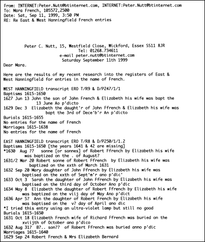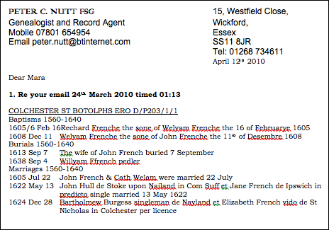 I have the records for Coggeshall, Terling, Birdbrook, Halstead, Assington, Greenstreet, Gosfield, Weatherfield, Great Bardfield, Arkesden, Great Maplestead, Sible Hedingham, Bures St. Mary and others for the surname French. See England Charts. Hiring researchers in England who can read the old English script and who have special permission to view the original records with a blue light, is expensive and time-consuming, but worth it to me. I have the knowledge of all these families in my head, but these researchers provide invaluable clues, especially court cases and land records. Many of these records prove at least that the person involved is an adult and not a child.