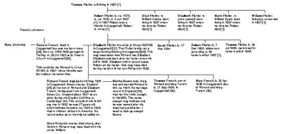 According to the DNA tests, Group 3 shows a family connection between Richard French of this chart FFA Chart #6 of Coggeshall, England, and Edward French of FFA Chart #4 and FFA Chart #E4 who was from Warwickshire, England. However, Richard was from Coggeshall, Essex, England, and Edward was from Rugby, Warwickshire, England, quite a distance apart.