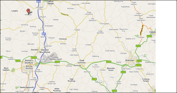 Map shows Arkesden, Manuden, Albury, Farnham, BishopÕs Stortford, and moving eastward to Great Bardfield and Wethersfield, and eventually to Halstead. Note the London Stansted Airport and the M11 which makes it very difficult getting from the west side of M11 to the east side nowadays.