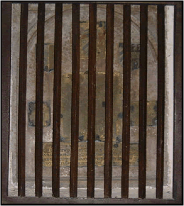 Thomas Burrough d. 19 Jun 1597 [45]. Thomas Burrough was b. ca. 1531 in Higham, Suffolk, England [46]. A memorial in Elizabethan brass in a recess behind a wooden grill at the Wickhambrook church is dedicated to Thomas Burrough, shown between his two wives, Elizabeth and Bridget and their 9 children grouped above them.