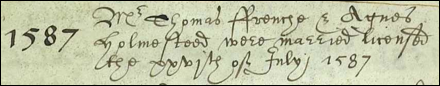 ca. 1551, m. Anne or Agnes Olmstead in 1587 in Farnham, Thomas d. 1613 in Halstead. Agnes Olmstead b. 1566 in