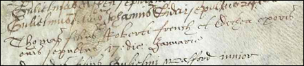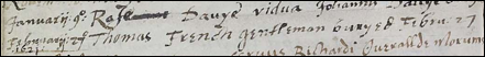 [23] Frating, Essex, 27 Feb 1621, Thomas French, gentleman, buryed Feb 27. Thomas was b. 1567 or 1570 (llegible in will).