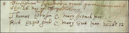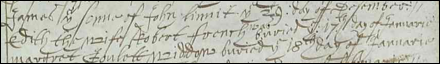 [26] Essex County Council, Essex Record Office, County Hall, Chelmsford, CM1 1LX, England. Research completed 26 Apr 1990, Order No. GS 99/90 for 3 hrs, Halstead Parish Register, burials 1608 to 1639. Nine deaths of French in Halstead between 1608 and 1639. Mr. Thomas FrenchÕs mother-in-lawe died 12 Oct 1620, her name being Mrs. Wood. The term Òother-in-lawÓ often described a step-mother.