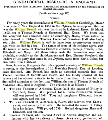 2.5* Thomas French II [1], of Wethersfield, Essex, b. ca. 1530 in Arkesden. No parish registers for Arkesden survive before 1690.