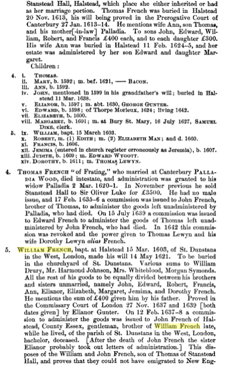 [34] Francis (male) probably d. before 1621 since he is not mentioned in his brotherÕs will; however, there was a Frances (female) living in Halstead in 1622 [33]. Francis is mentioned in his fatherÕs will of 1613 as the son of Thomas French.