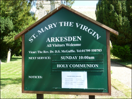 Parts of the church of St. Mary the Virgin date from the 14th century, but the church existed long before that time. Arkesden itself is mentioned in the Domesday Book and is situated 18 miles from Cambridge, 40 miles from London, and just 5 miles from Saffron Walden. The churchyard contains a number of 18th century tombstones. The tower is entirely Victorian, replacing a medieval one in 1855 when traces of a round tower were discovered. It houses six bells in excellent ringing order, which were fully restored in 1999. Four of the bells are the originals, cast in 1701. The others were cast in 1814 and 1931. In 1862 the population was 506, but today it is about 300. An occasional stream runs though the center of the village which is 457 feet above sea level, the highest point in Essex County.