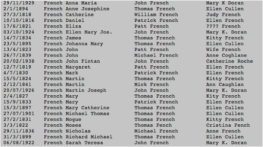 Relationship of these Ffrenches to one another is unknown unless stated. The dates given at the left are only the dates of when the event took place, not necessarily the birthdate.
