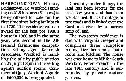 Home of Peter French, b. 1844, d. 1929, in Harpoonstown on 54 acres, for sale on 29 Jul 2004, listed in the FarmerÕs Journal of 10 Jul 2004, page 28 [13]. Peter became M.P. for South Wexford.
