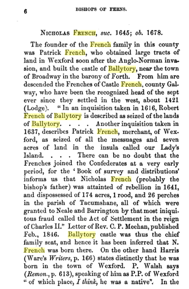 For more on this article, see Collections on Irish Church History, and all pages about Nicholas Ffrench, the Bishop of Ferns, pgs. 6-22 [6]. Website: http://books.google.com/books?id=BzcNAAAAYAAJ&pg=PA6&lpg=PA6&dq=Ballytory+%2BFrench&source=bl&ots=mVhwDmvgTn&sig=qwJ-T1HxLWY8vOgf21rLQ-2EFyw&hl=en&sa=X&oi=book_result&resnum=9&ct=result#PPA22,M1