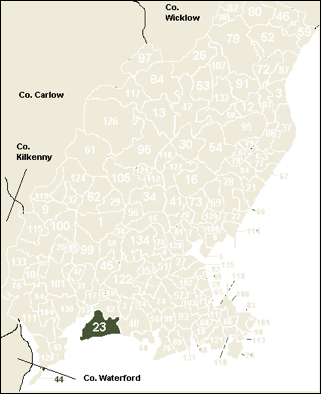 Names of Ffrenches at the Bannow Cemetery in Wexford, Ireland below were copied by me in about 1990 from the original stones. I also have many photographs which I will add later – they are still in analog format. The parish of Bannow is shown below as #23. If you can find Wellingtonbridge on a map, Bannow Cemetery is at the tip of an estuary at Bannow Bay. One could see how ships drifted toward the low shoreline of Bannow, the site of the Bannow cemetery. Photos were taken in August 1997. Mara