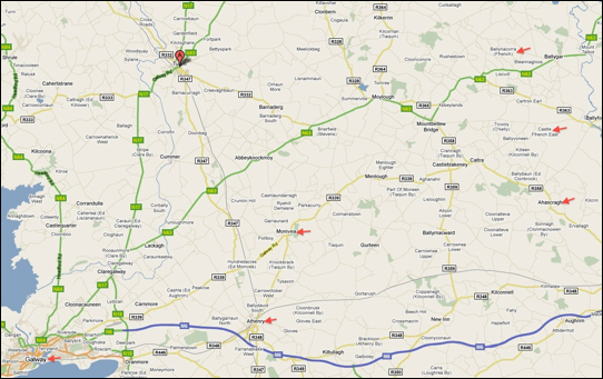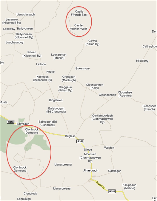 The ffrench family of Castle ffrench, the topic of this page, lived 12 miles NW from Ballinasloe where Thomas Ridley French lived (FFA Chart #IREJ), 5 miles North from Ahascargh, 35 miles NE from Galway where Walter ffrench lived (FFA Chart #IRED), 25 miles NE from Monivea where Robert Percy ffrench lived (FFA Chart #IREH) -- (all in County Galway) -- , and 3 hours by car from either Dublin or Shannon.