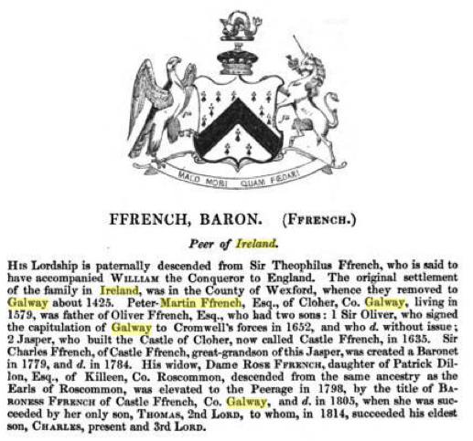 This is a very extensive ffrench family. There is so much information online about them that I plan to include only a small part here. I am mainly trying to research the connection of the French and ffrench families born in Ireland who immigrating to America. This family does migrate to America – to Massachusetts in the 20th century; however, it daughters out. There are probably many more connections that I am unaware of. I was able to visit the last Baron ffrench of Castle ffrench in 1996. Mara