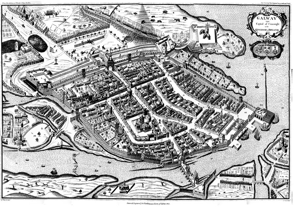 Map of Galway, Ireland, in 1651. St. Nicholas Church was 300 years old then. The 14 tribes of Galway developed and ruled Galway for centuries.